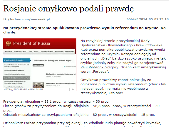 a wystarczy zajrzeć pod podany link do Forbesa, aby się dowiedzieć, że to nie żadne „prawdziwe wyniki referendum na Krymie” tylko wyniki jakichś bliżej nieznanych sondaży i badań ankietowych: